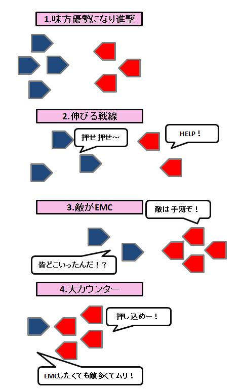 終わりませんでした。突然EMCされた先はN2,エンペ直下。もうFEに行く時間もありません、まさに背水の陣。敵さんもまさかイナバしてくるとは思ってなかったのでしょうか、バリ攻撃時に比べると行軍精度が落ちてるような気がしました。一見防衛側は囲まれてて不利なんですが、敵の手薄なところへ攻撃し、各個撃破を狙います。(イメエジ画像は『皇国の守護者』最終巻を参照)最後にエンペ南西に敵主力GがEMCしてこれはさすがに・・!と思った矢先の黄色ログ。紙一重で逃げ切る格好となりました。